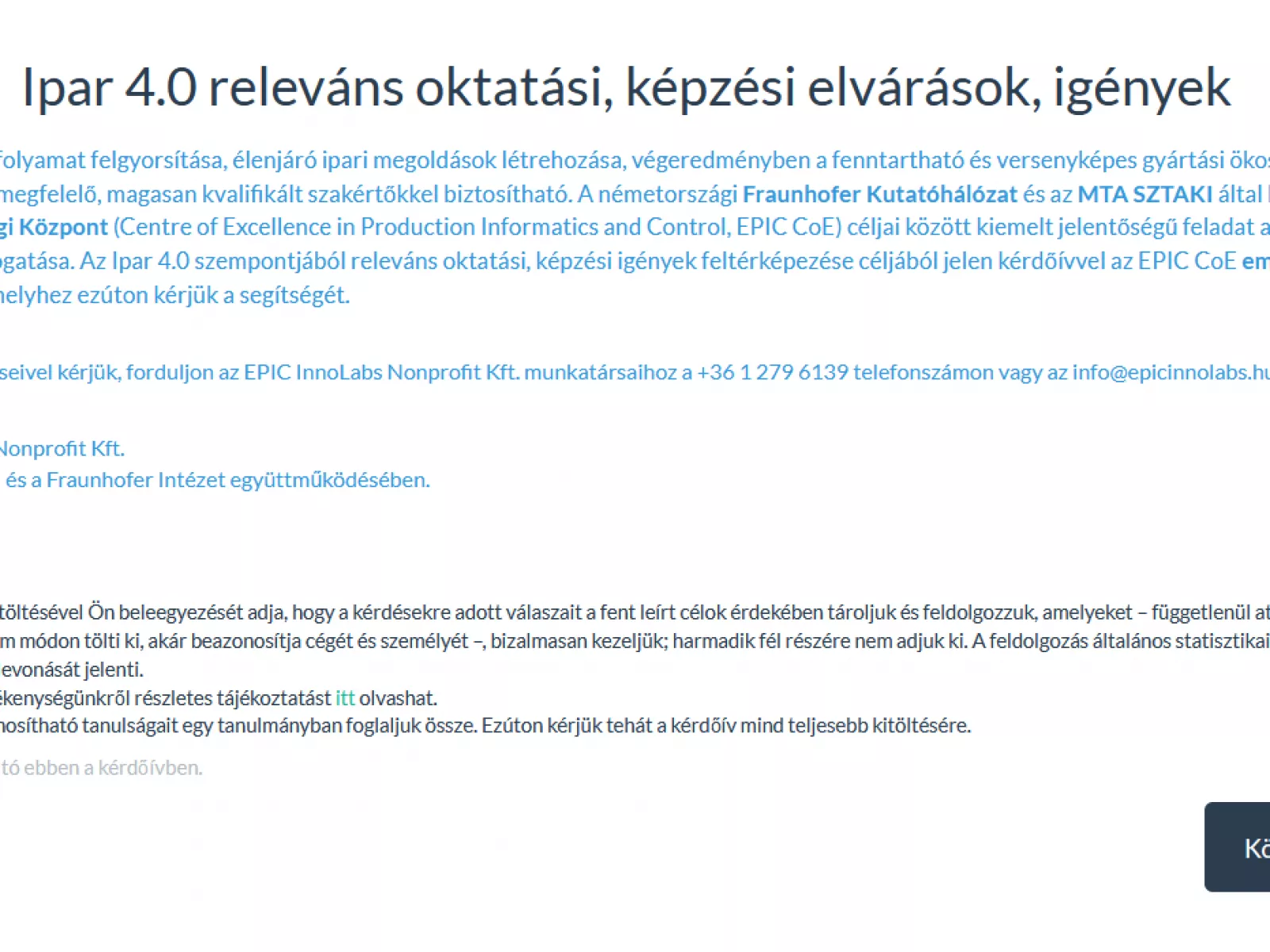 A németországi Fraunhofer Kutatóhálózat és az MTA SZTAKI által létrehozott EPIC Kiválósági Központ (Centre of Excellence in Production Informatics and Control, EPIC CoE) céljai között kiemelt jelentőségű feladat a tudástranszfer támogatása. Az Ipar 4.0 szempontjából releváns oktatási, képzési igények feltérképezése céljából jelen kérdőívvel az EPIC CoE empirikus kutatást végez.